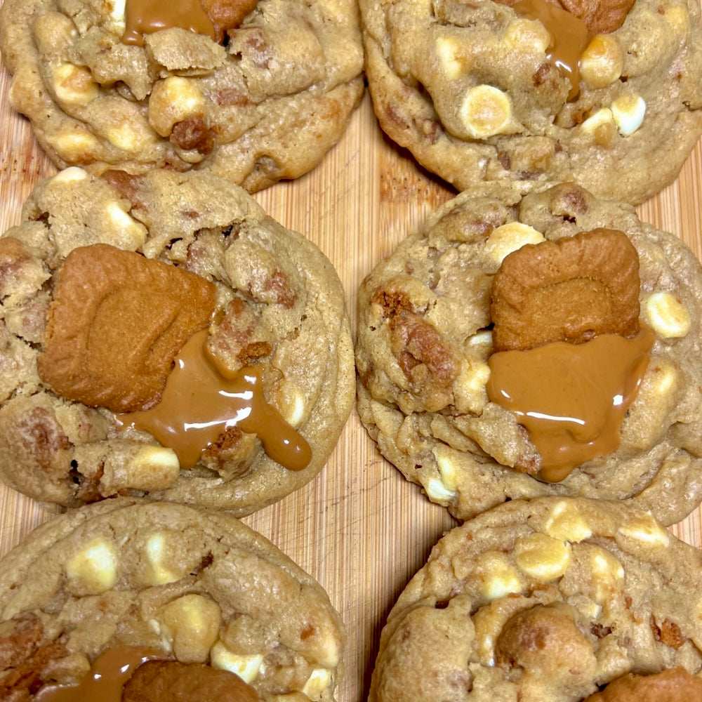 A brown sugar cookie butter based cookie loaded with Biscoff cookie pieces and white chocolate chips. Crispy exterior and a ooey gooey center. This cookie is not too sweet & absolutely delicious.