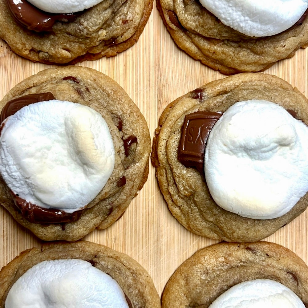 Experience the taste of our Campfire S’mores Cookie. An upgrade from our Brown Butter Chocolate Chip Cookie with crunchy Graham Cracker pieces, a hint of smoke for that real deal “by the campfire” feel. We top it off with a Hershey’s chocolate bar & a huge marshmallow.