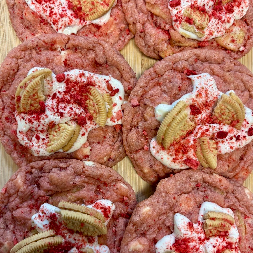 A brown Sugar based cookie turned pink! This cookie is loaded with dried strawberries for a perfect tang, Golden Oreos for added crunch & creaminess. We top it off with a light drizzle of white chocolate to balance the tanginess with something nice & sweet.